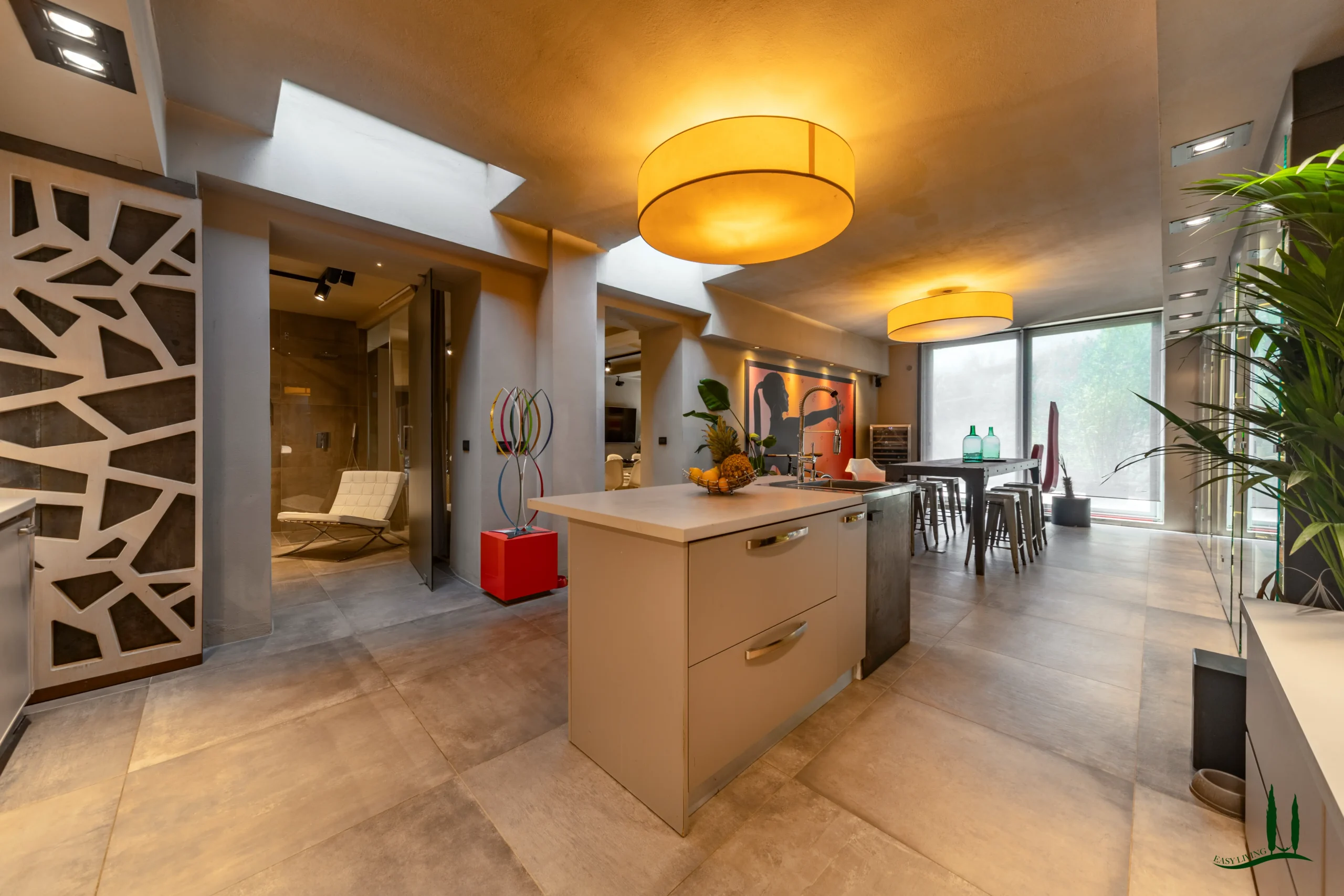 Piano terra: Attraverso un luminoso giardino d'inverno in vetro si entra in uno spazio aperto che sembra una galleria d'arte. La cucina di design è abbinata a un