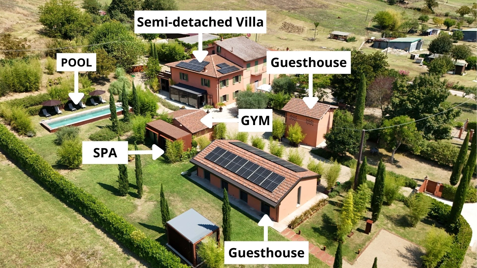 La proprietà si compone di quattro edifici indipendenti più una villa bifamiliare, ciascuno